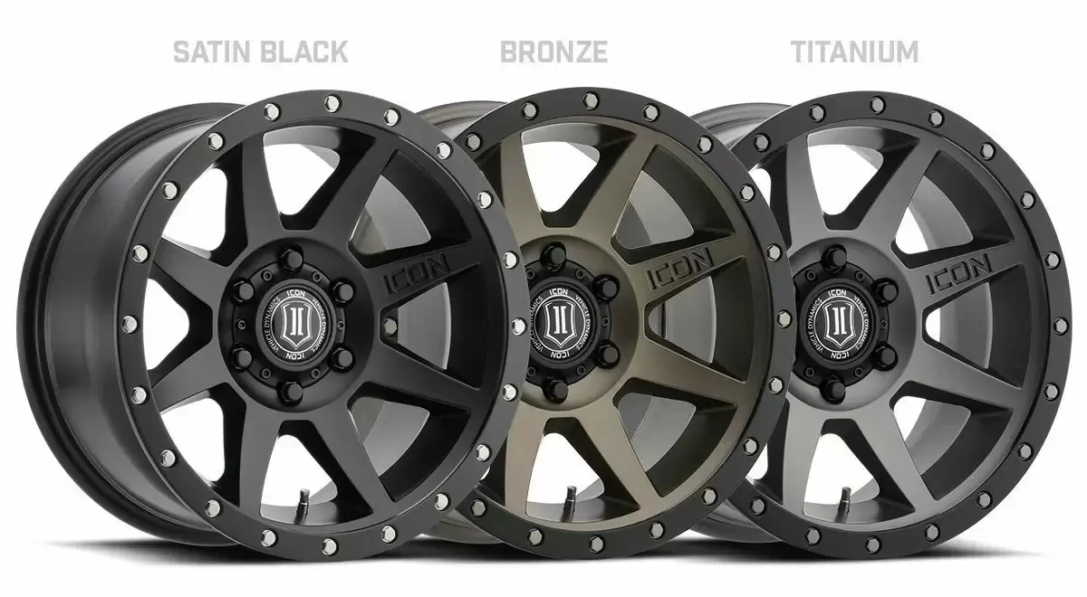 Bring a bold new look to your ride with the all-new ICON Alloys REBOUND! Combining sharp lines, a concave spoke design, and “ICON-optimized” dimensions, these wheels will increase both the form and function of your Jeep, truck, or SUV. Staying true to the ICON Alloys approach, the REBOUND has been engineered to maximize caliper clearance and optimize wheel position for un-hindered suspension travel and steering function. Backspace dimensions and wheel offset have been strategically developed to reduce scrub radius, improving all-around handling and ride quality and making a set of these wheels the perfect complement to an ICON Vehicle Dynamics suspension system.