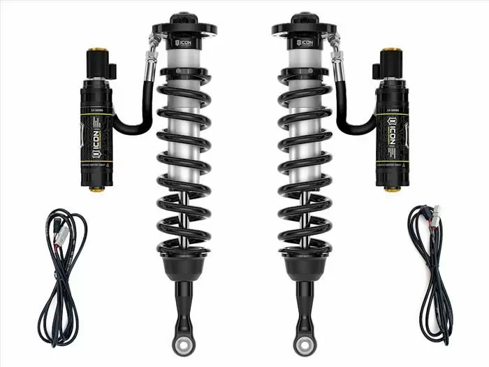 The ICON Vehicle Dynamics V.S. Series 2.5” remote reservoir coilover shocks w/ CDCV are an incredible upgrade for the front end of the 2014-UP Toyota Tundra. ICON’s Vehicle-specific valving provides a sport tuned feel on and off-road while offering 1-3” of lift height adjustability for use of larger, more aggressive wheel and tire combinations. ICON’s larger 2.5” shock body and increased piston area over stock components provides improved damping ability and outstanding ride characteristics across varying types of terrain. Remote reservoirs ensure optimum performance by increasing the duration of consistent damping regardless of situation, keeping the shocks at a cooler operating temperature during heavy use. The ICON CDE Valve upgrade is included for those desiring an easy way to tune the ride electronically from inside the vehicle.