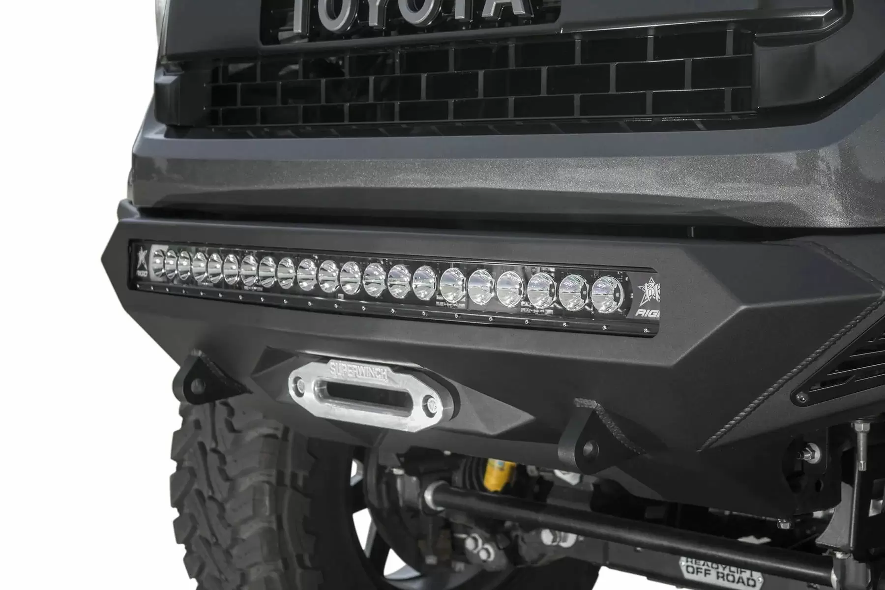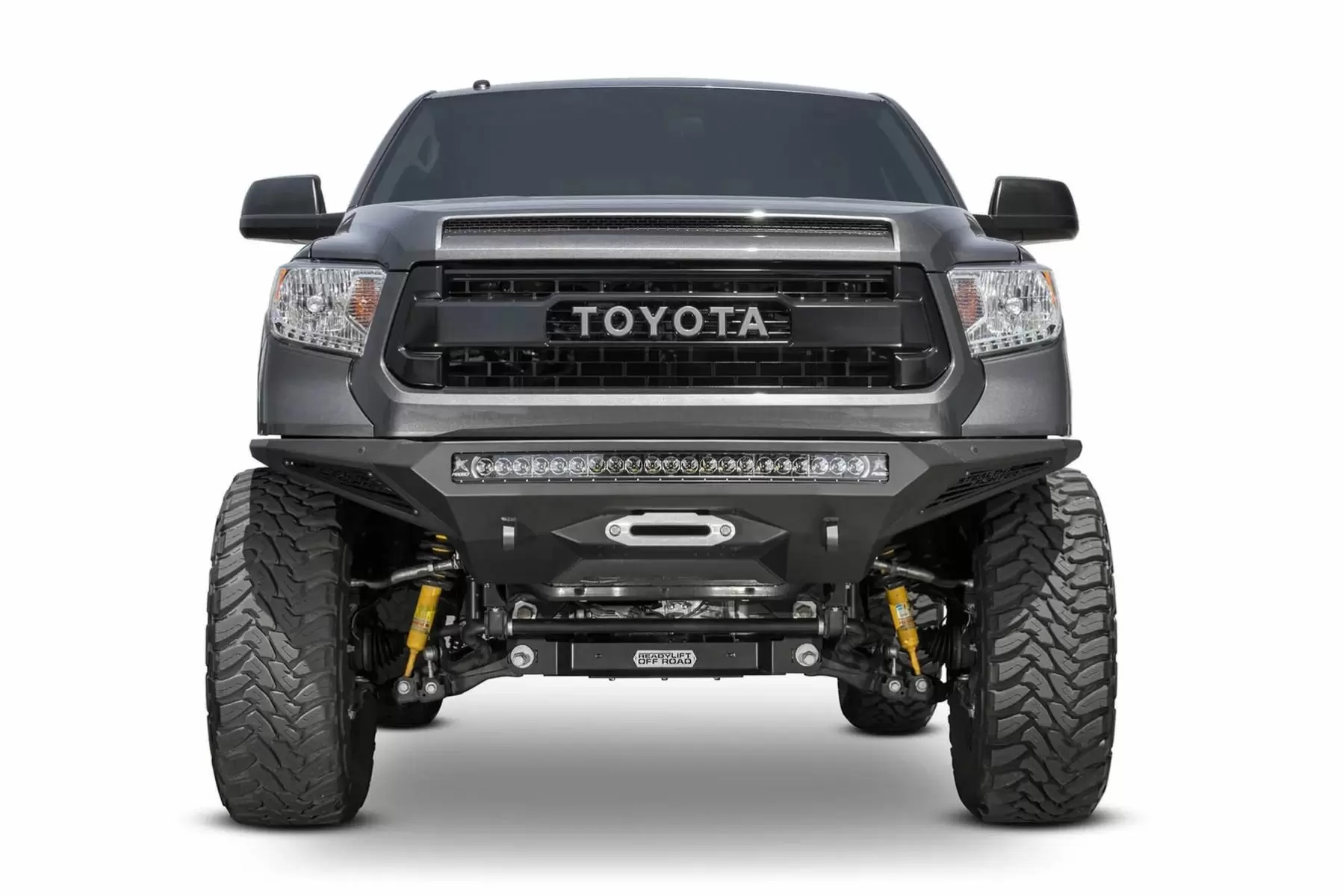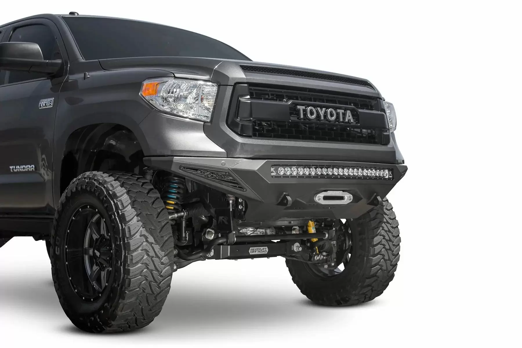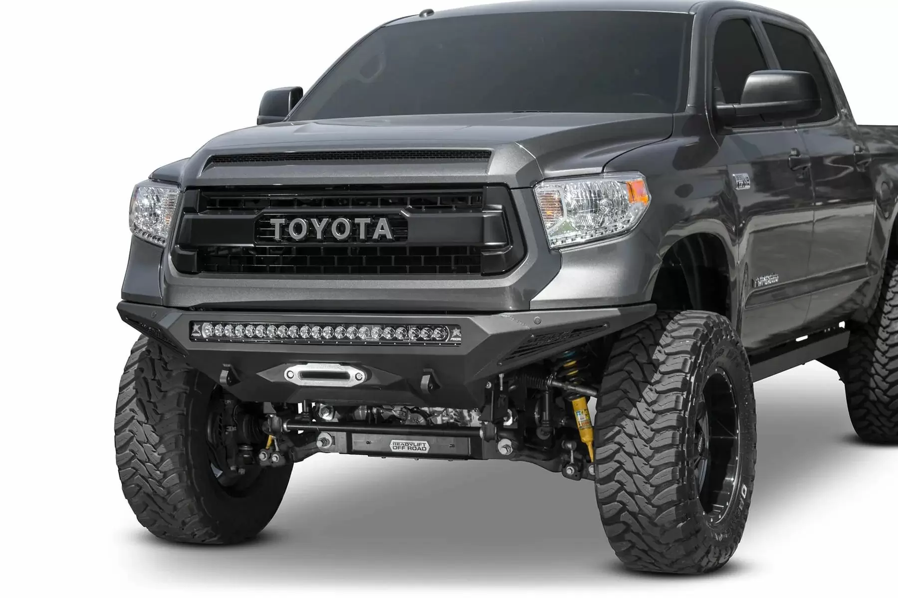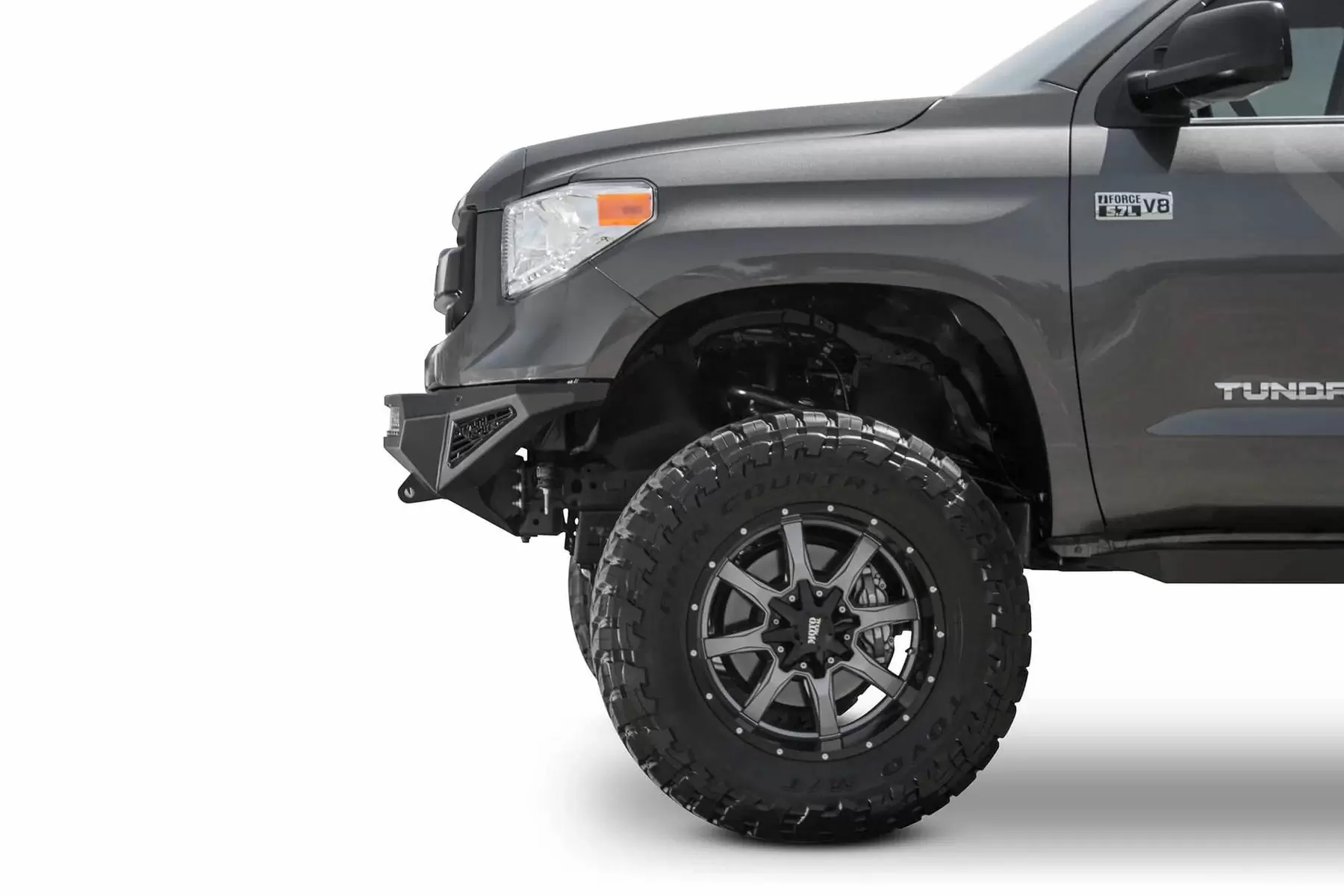 Addictive Desert Designs Stealth Fighter front bumper for the Toyota Tundra is an aggressive modern radius plate design that fits tight around the Tundra’s frontend. A steel plate design provides additional protection and a winch mount provides additional utility for your truck.