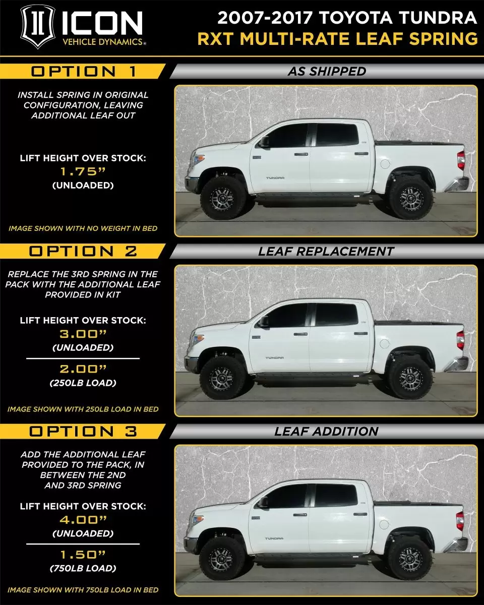 Through an accelerated testing process dubbed the “ICON1K” R&D program, ICON has spent over a year pushing the Tundra to off-road extremes to identify limiting factors in OE components and further extrapolate performance out of this vehicle. In a push to provide unparalleled ride quality and vehicle dynamics for everything from high-speed desert running to off the grid expedition, the RXT Rear Suspension System was born. The RXT Rear Suspension System is a combination of an all new ICON multi-rate leaf spring, a hydraulic rear bump stop kit, and three RXT-specific 2.5 Series rear shock options. Installation of this system replaces the aforementioned “limiting factors” and completely redefines the potential of the 2007-2017 Toyota Tundra with a 20% increase in wheel travel and the ability to adjust the leaf spring rate to compensate for varying vehicle setups.