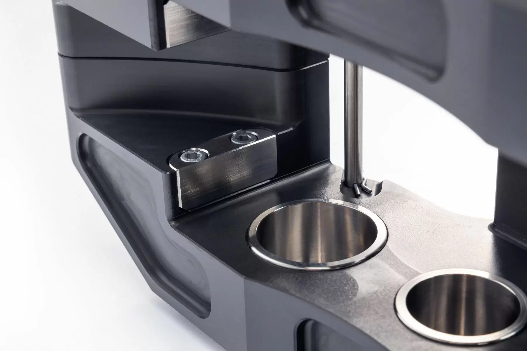 - Our 350x34mm (13.77”) – 48 vane 1-piece rotors are a world first with curved cooling vanes (additional surface area) which are directional for maximum cooling and each rotor has the MTR (Max Temperature Recording) paint system.