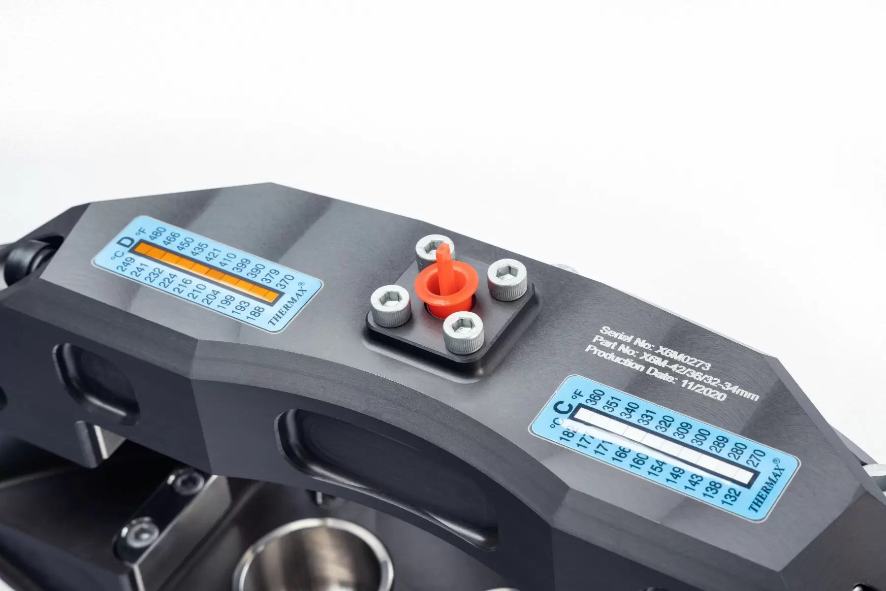 - Our 350x34mm (13.77”) – 48 vane 1-piece rotors are a world first with curved cooling vanes (additional surface area) which are directional for maximum cooling and each rotor has the MTR (Max Temperature Recording) paint system.